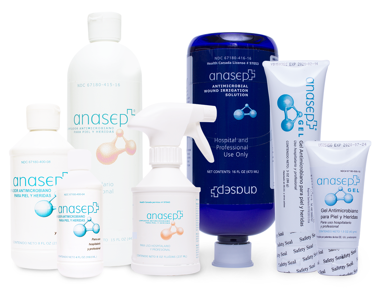 ANASEPT® es un antimicrobiano de amplio espectro (bactericida, viricida, esporicida, fungicida) especializado y multifuncional diseñado para el manejo eficaz de la biocarga en todo tipo de heridas.